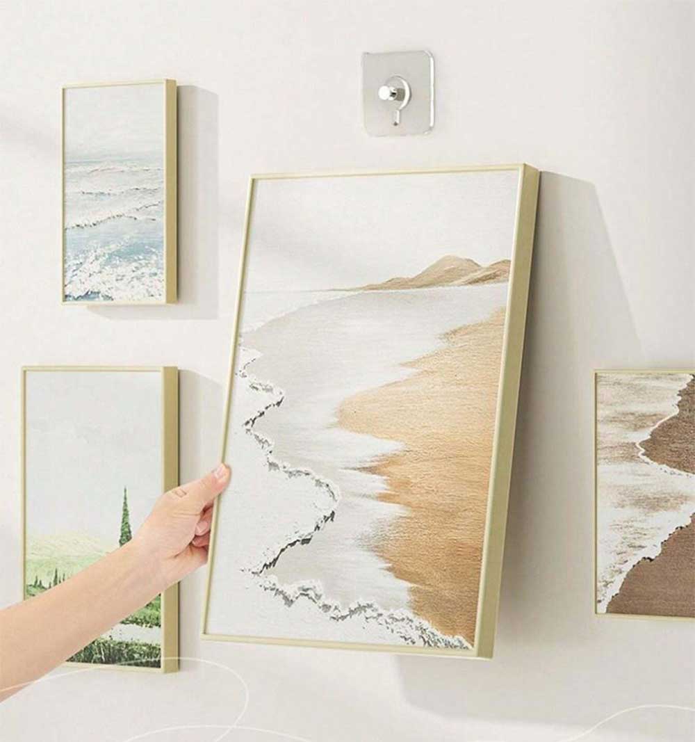 شنكل حائط مبتكرة وسهلة الاستخدام، لا تحتاج إلى مسامير أو أدوات للتثبيت. مثالية لتعليق الصور، الساعات، الإطارات، والزينة الداخلية بطريقة أنيقة وغير ملحوظة.