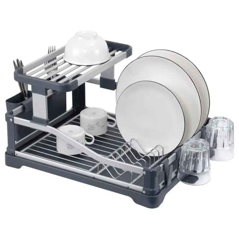 حافظي على مطبخك منظمًا وأنيقًا مع رف الصحون الألمنيوم ثنائي الطابق بتصميم عصري يجمع بين الفضي والرمادي.