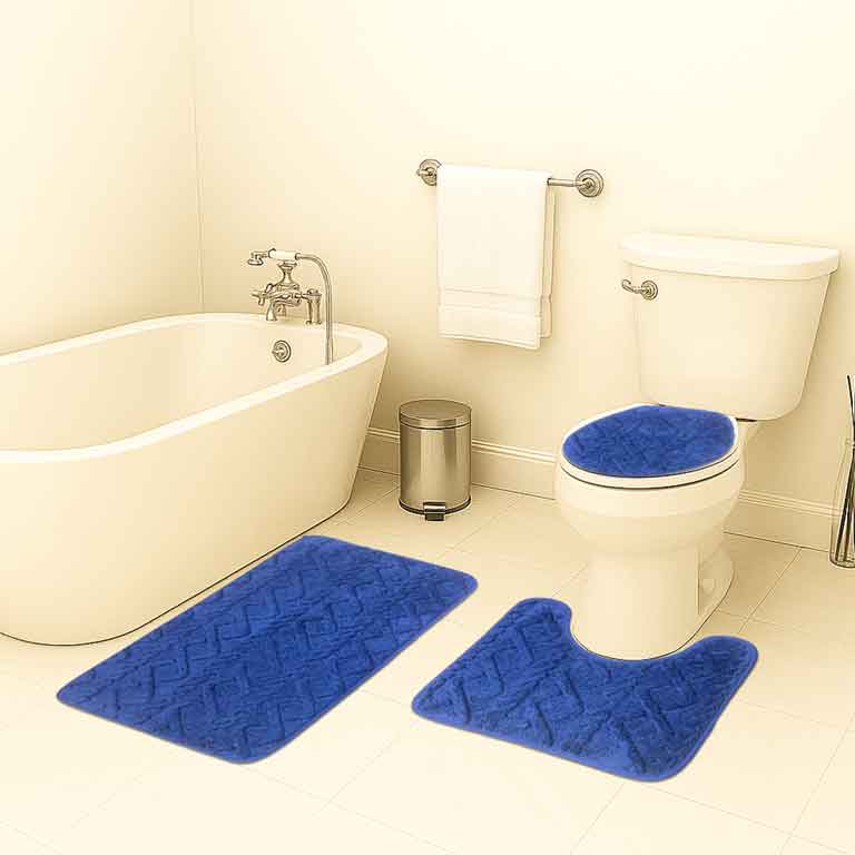 الطقم يتكوّن من 3 قطع أنيقة من الموكيت المجدّل الناعم الذي يمنح قدميك راحة فائقة بعد كل استحمام، مع تصميم عملي يحافظ على أناقة الأرضية.