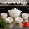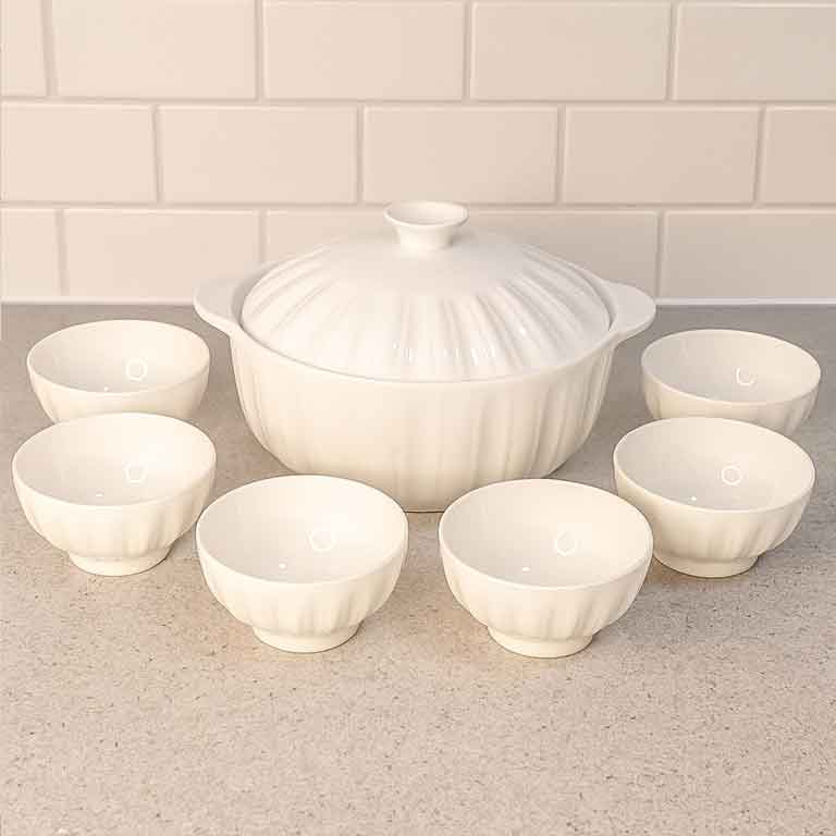 الطقم يتكوّن من جاط سيراميك بسعة 3.5 لتر مع غطاء محكم يحافظ على حرارة الطعام لفترة أطول، بالإضافة إلى 6 زبادي متناسقة في الشكل والحجم لتقديم الشوربة أو المقبلات بطريقة راقية.