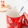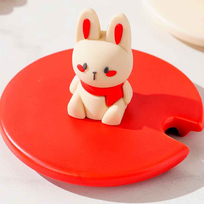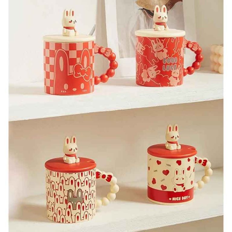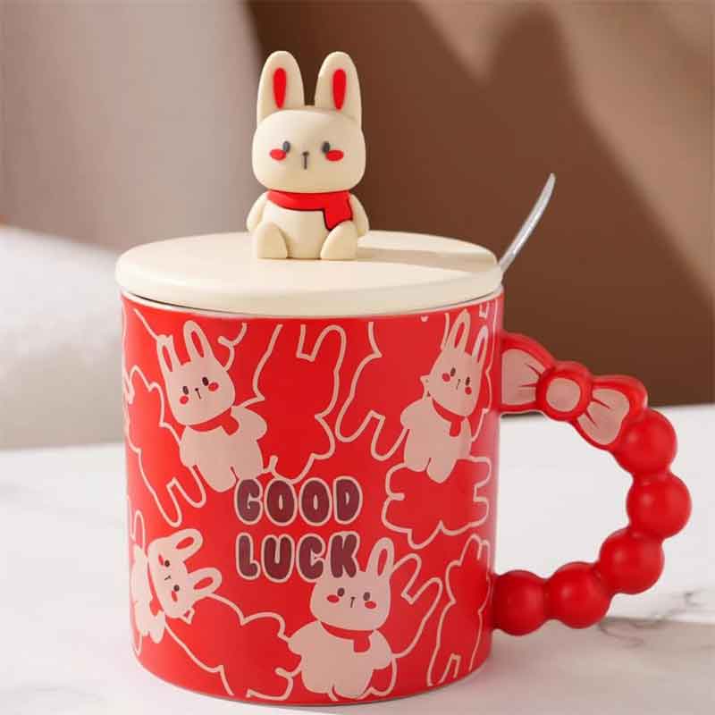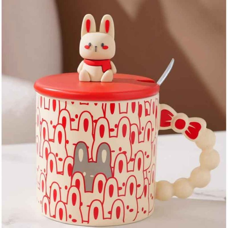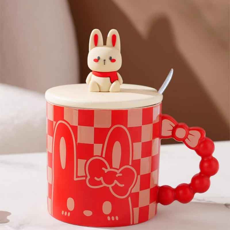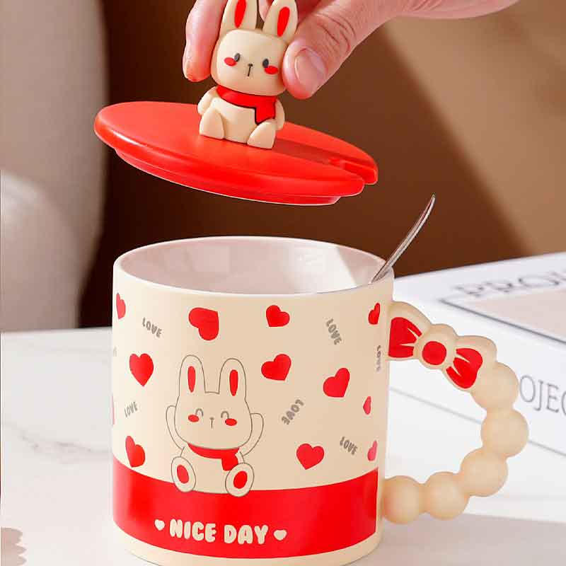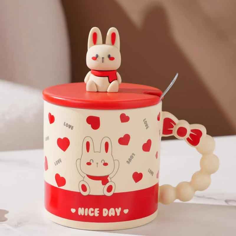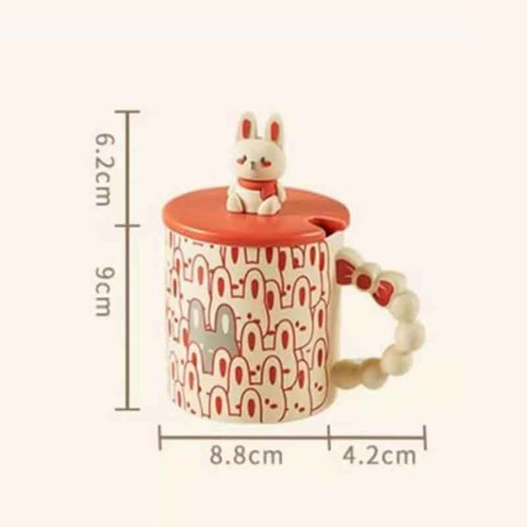 كوب سيراميك بغطاء وملعقة – تصميم أرنب كيوت سعة 400 مل