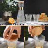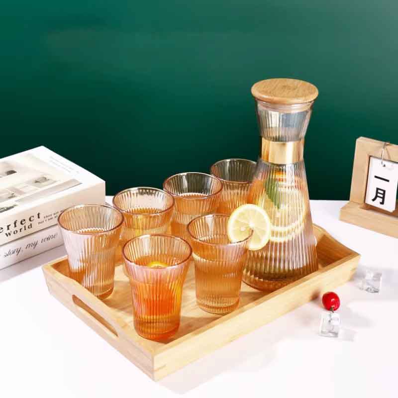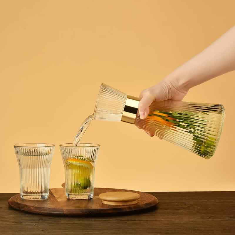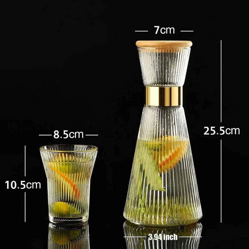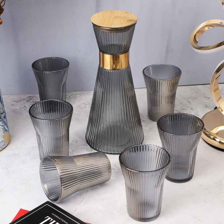 يتكون الطقم من 7 قطع: إبريق واحد بسعة 900 مل مع غطاء محكم يحافظ على نضارة المشروبات، و6 كاسات رفيعة بسعة 200 مل لكل منها. مثالي لتقديم الماء، العصائر، الشاي المثلج أو أي مشروبات باردة بأسلوب راقٍ في المناسبات أو الاستخدام اليومي.