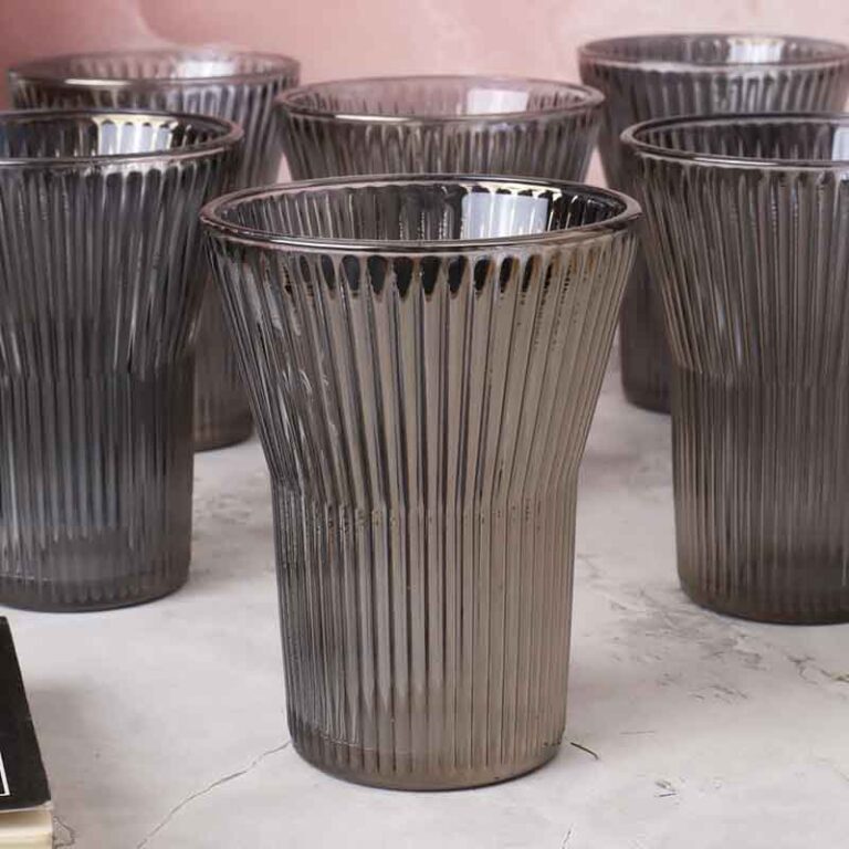 أضف لمسة من الفخامة إلى طاولة التقديم مع طقم شاف فاخر مع 6 كاسات بتصميم عصري. يتميز هذا الطقم الزجاجي الراقي بتصميم مخدد أنيق يجمع بين البساطة والرفاهية، ويأتي بلونين فاخرين هما الأسود والعسلي ليناسب مختلف الأذواق والديكورات.
