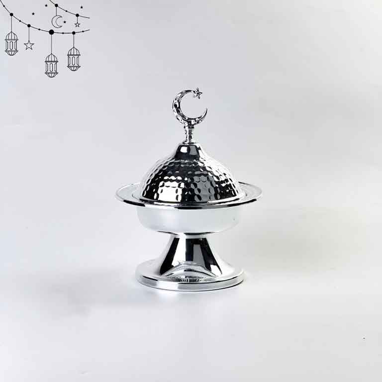 تتميّز بغطاء على شكل قبة مزينة بهلال ونجمة يضفي طابعًا رمضانيًا فخمًا ويحافظ على التمر محميًا أثناء التقديم.