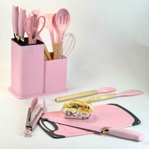 طقم أدوات مطبخ سيليكون مع لوح تقطيع وحافظة – 19 قطعة بمقابض خشبية - زهري