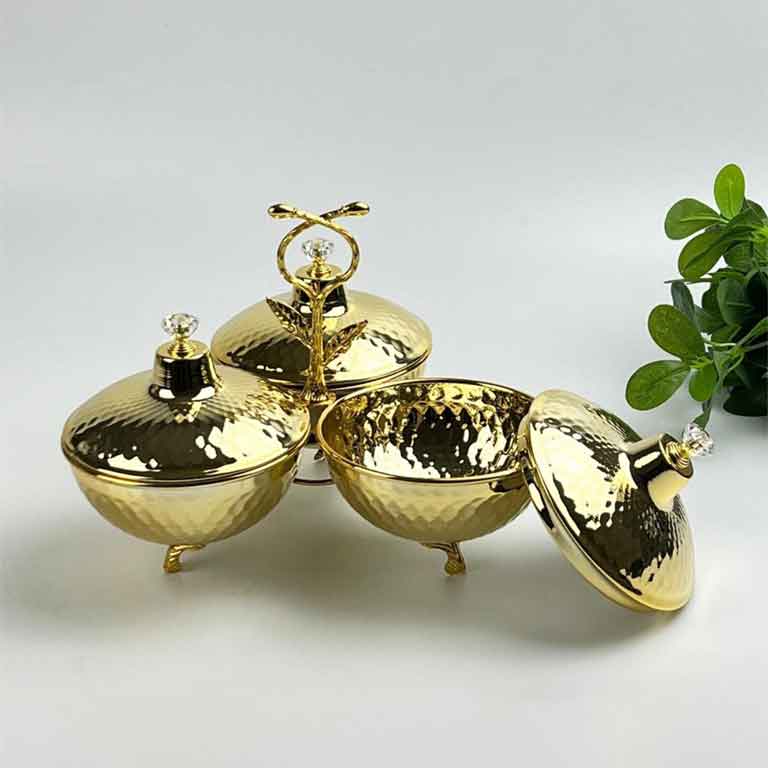 تتكوّن من ثلاث أوعية مع أغطية متناسقة مربوطة مع حامل معدني أنيق يسهل التقديم ويضيف لمسة جمالية إلى طاولة الضيافة.