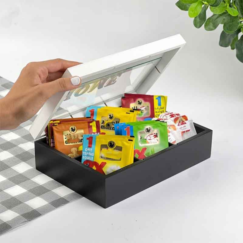أضف لمسة من الأناقة والتنظيم إلى مطبخك مع علبة تخزين الشاي الخشبية من مسك جاليري.
